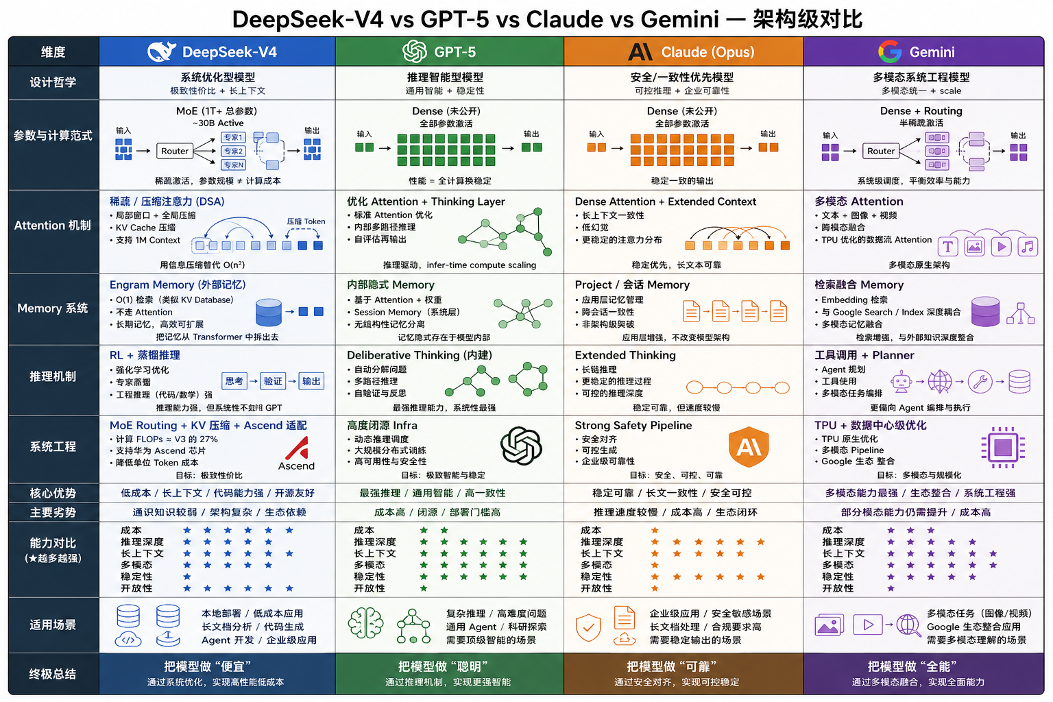 Deepseek-V4 VS GPT5 vs Claude vs Gemini 架构级对比
