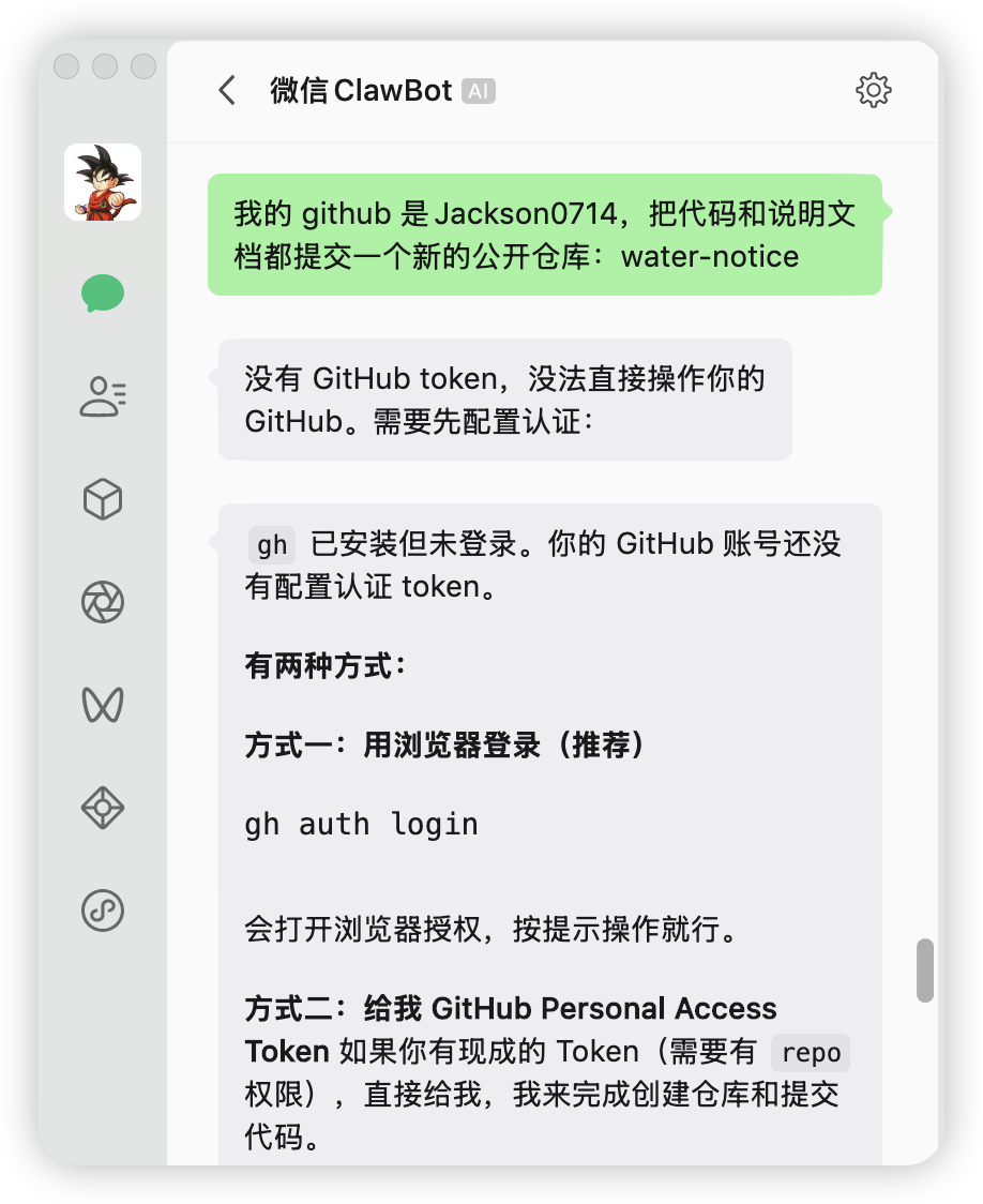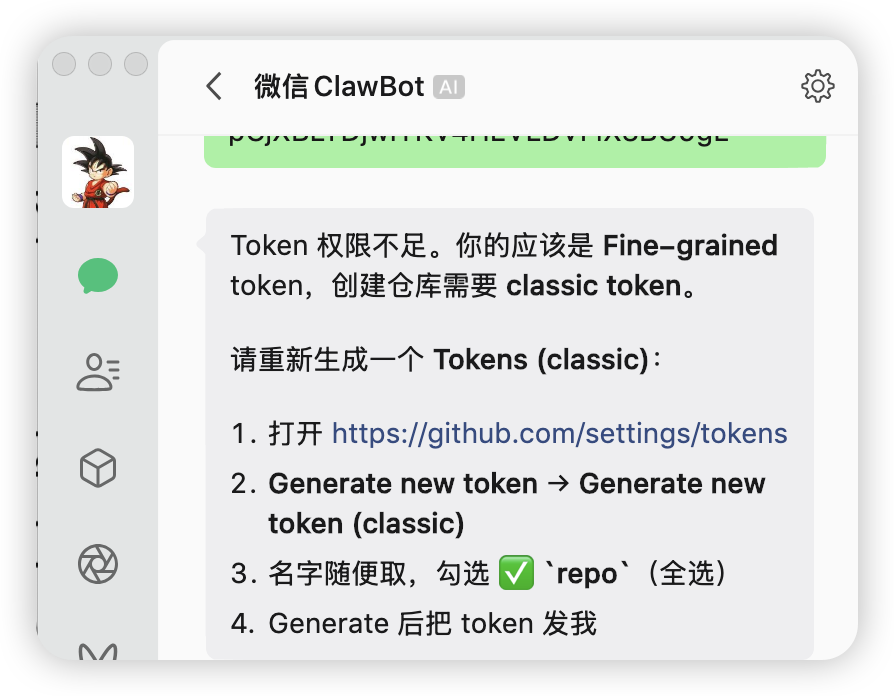 前提是需要创建一个 github token。而如何创建 github token 也是 openclaw 告诉我的,如下图所示: