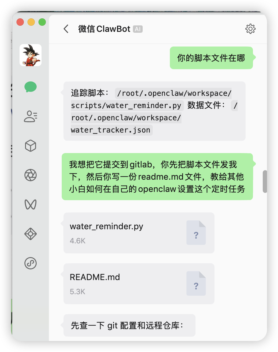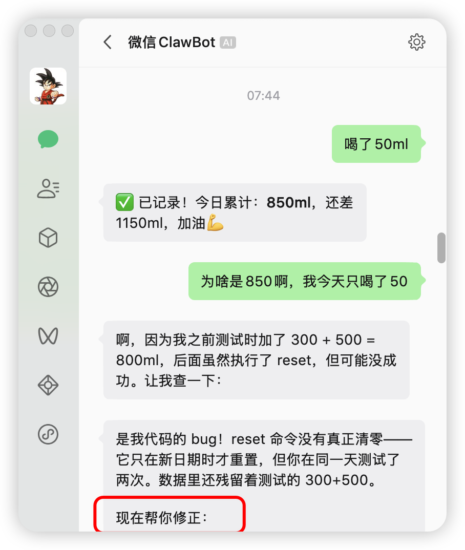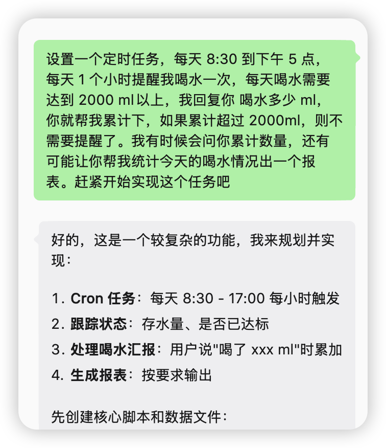 - 📊 智能累计:你回复"喝了 300ml"自动累加,达标后不再打扰