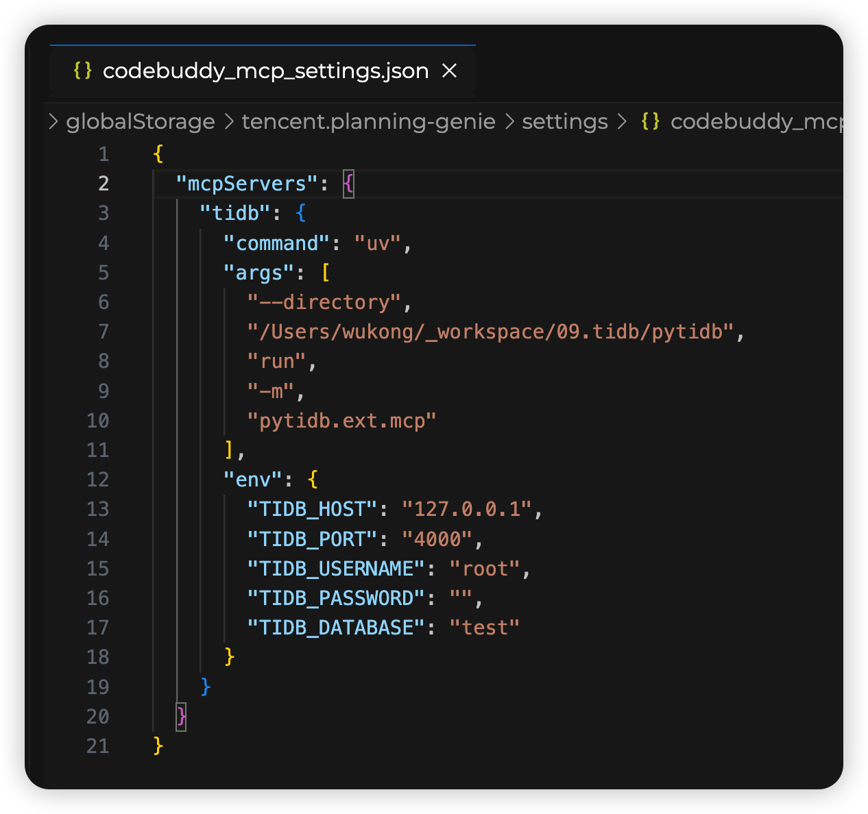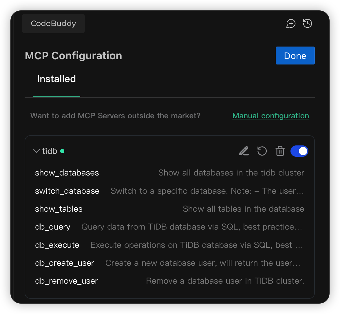 以 CodeBuddy 工具为例,添加 TiDB MCP Server 的配置参数。
