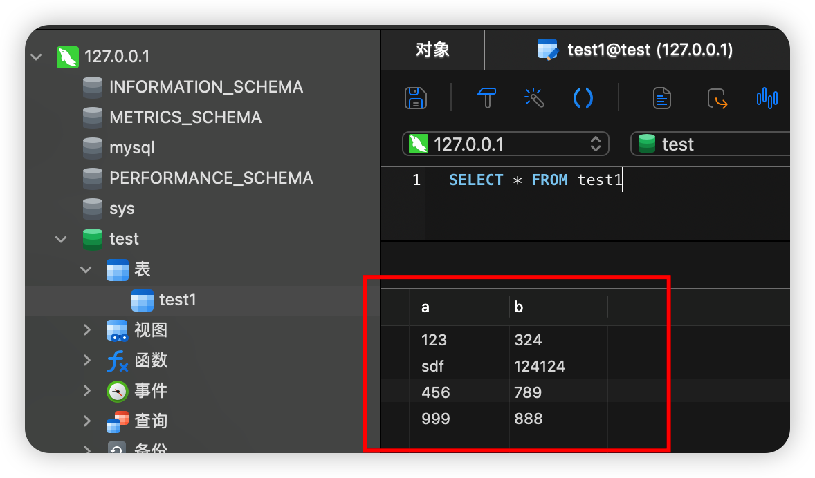 先往 test1 表插入几条测试数据,如下图所示:
