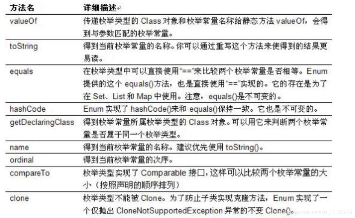* valueOf(String str):可以把一个字符串转为对应的枚举类对象。要求字符串必须是枚举类对象的“名字”。如不是,会有运行时异常:IllegalArgumentException。