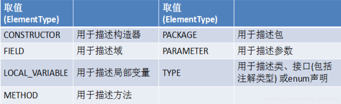 ElementType.TYPE_PARAMETER表示该注解能写在类型变量的声明语句中(如:泛型声明)。ElementType.TYPE_USE表示该注解能写在使用类型的任何语句中。