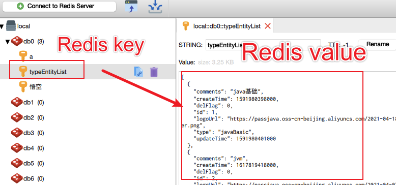 Redis key = typeEntityList,Redis value 是一个 JSON 字符串,里面的内容是题目分类列表。
