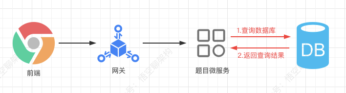 我们先来看下不使用缓存的情况:前端的请求先经过网关,然后请求到题目微服务,然后查询数据库,返回查询结果。