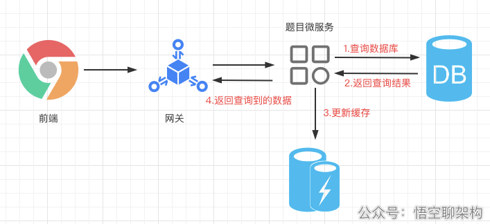 来看下使用缓存的情况:前端先经过网关,然后到题目微服务,先判断缓存中有没有数据,如果没有,则查询数据库再更新缓存,最后返回查询到的结果。