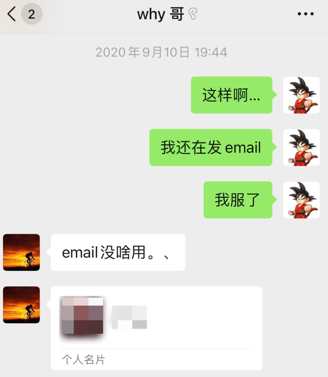 有的公众号还要发邮件,我真是醉了,why 哥说不要发邮件,直接丢给我一个联系人,让我加他好友,太感谢 why 哥了~