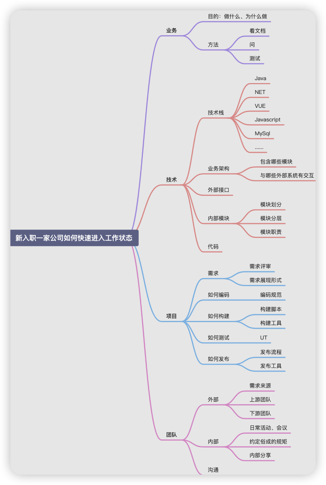 而在这个过程中主要有四个方面的知识那就是业务、技术、项目与团队贯穿始终。新入职一家公司,我们第一阶段的目标就是要具备能够跟着团队做项目的能力,因此我们所应尽快掌握的知识点也要从这四个方面入手。