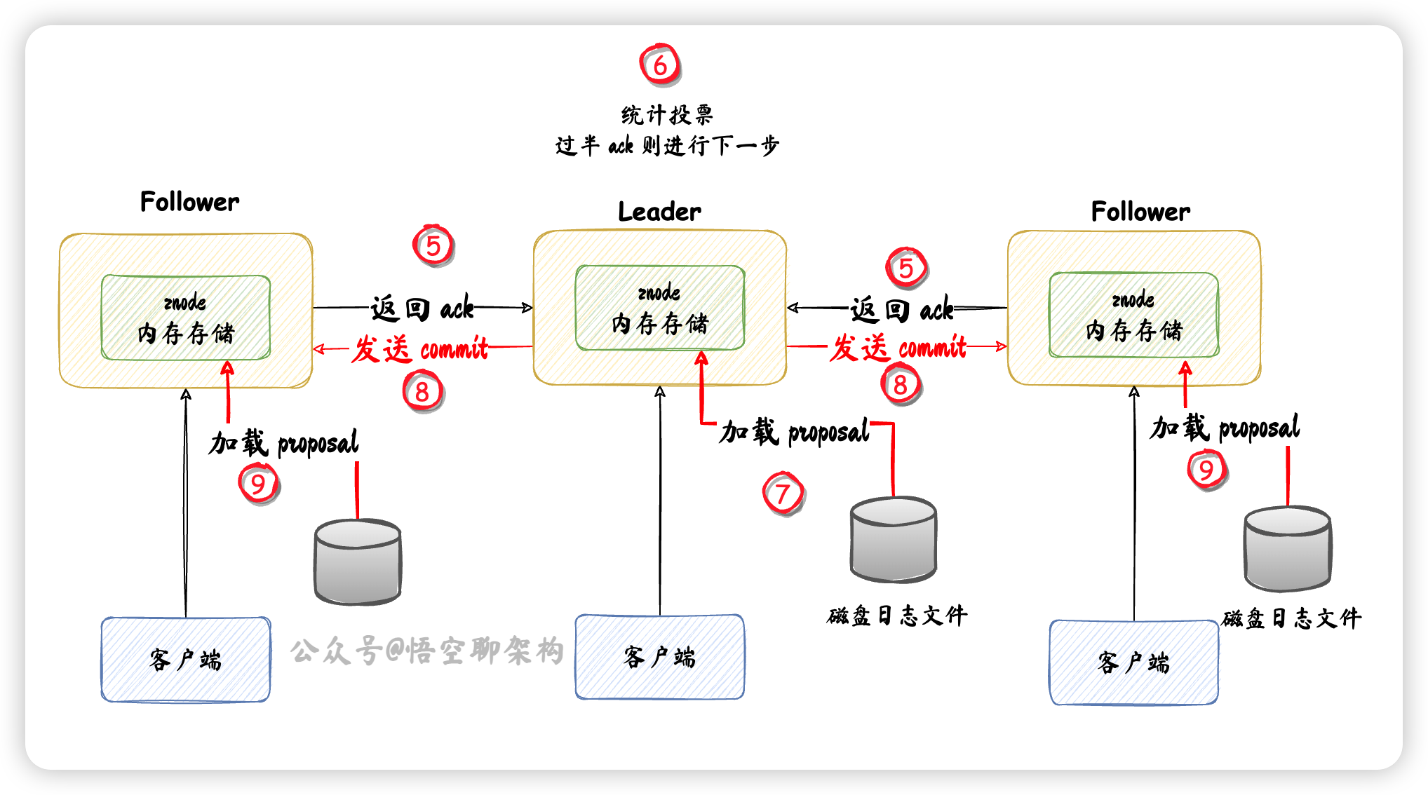 - ⑨ Follower 收到 commit 消息后,将 磁盘中数据加载到 znode 内存数据结构中。