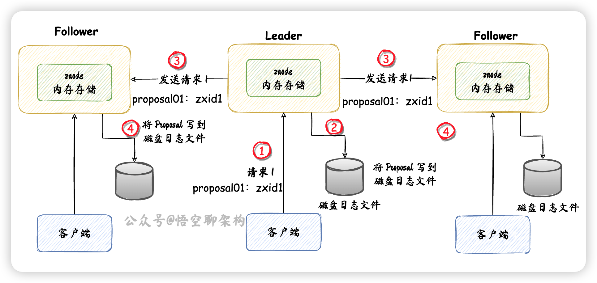 - ② Leader 收到写请求后,转化为一个 "proposal01:zxid1" 事务请求,存到磁盘日志文件。