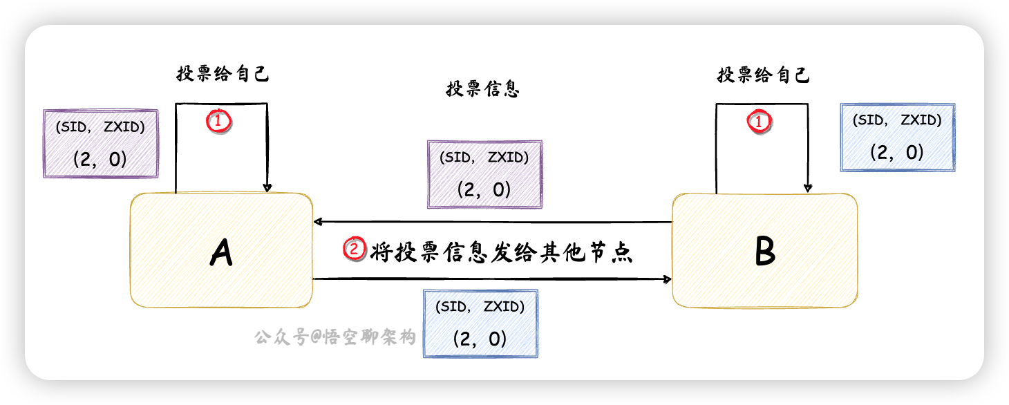 更新为别的节点发过来的投票信息,如果 ZXID 相等,则比较 SID。这里节点 A 和 节点 B 的 ZXID 相同,SID 的话,节点 B 要大些,所以节点 A 更新投票信息为(2,0),然后将投票信息再次发送出去。而节点 B不需要更新投票信息,但是下一轮还需要再次将投票发出去。