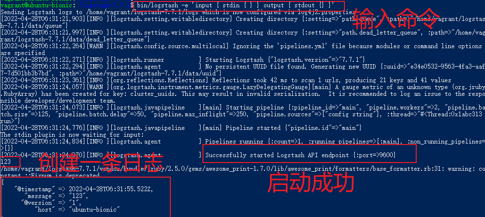 等 Logstash 完成启动后,我们在 stdin 里输入一下文字,我们可以看到如下的输出: