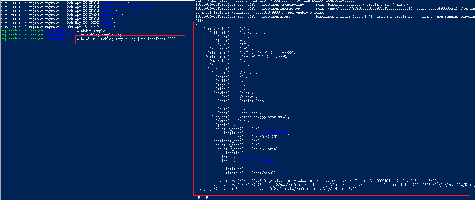 logstash 控制台打印出了 weblog-samle.log 中的内容: