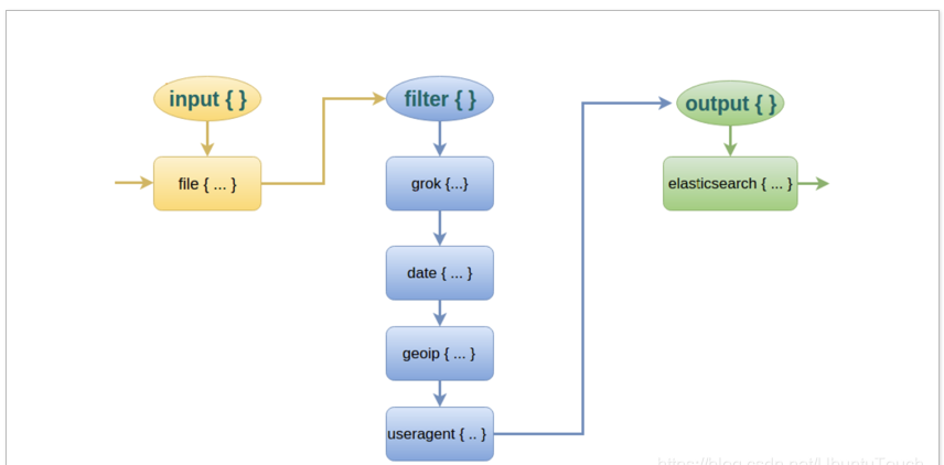 Logstash 配置文件有两个必需元素,输入(inputs)和输出(ouputs),以及一个可选元素 filters。 输入插件配置来源数据,过滤器插件在你指定时修改数据,输出插件将数据写入目标。
