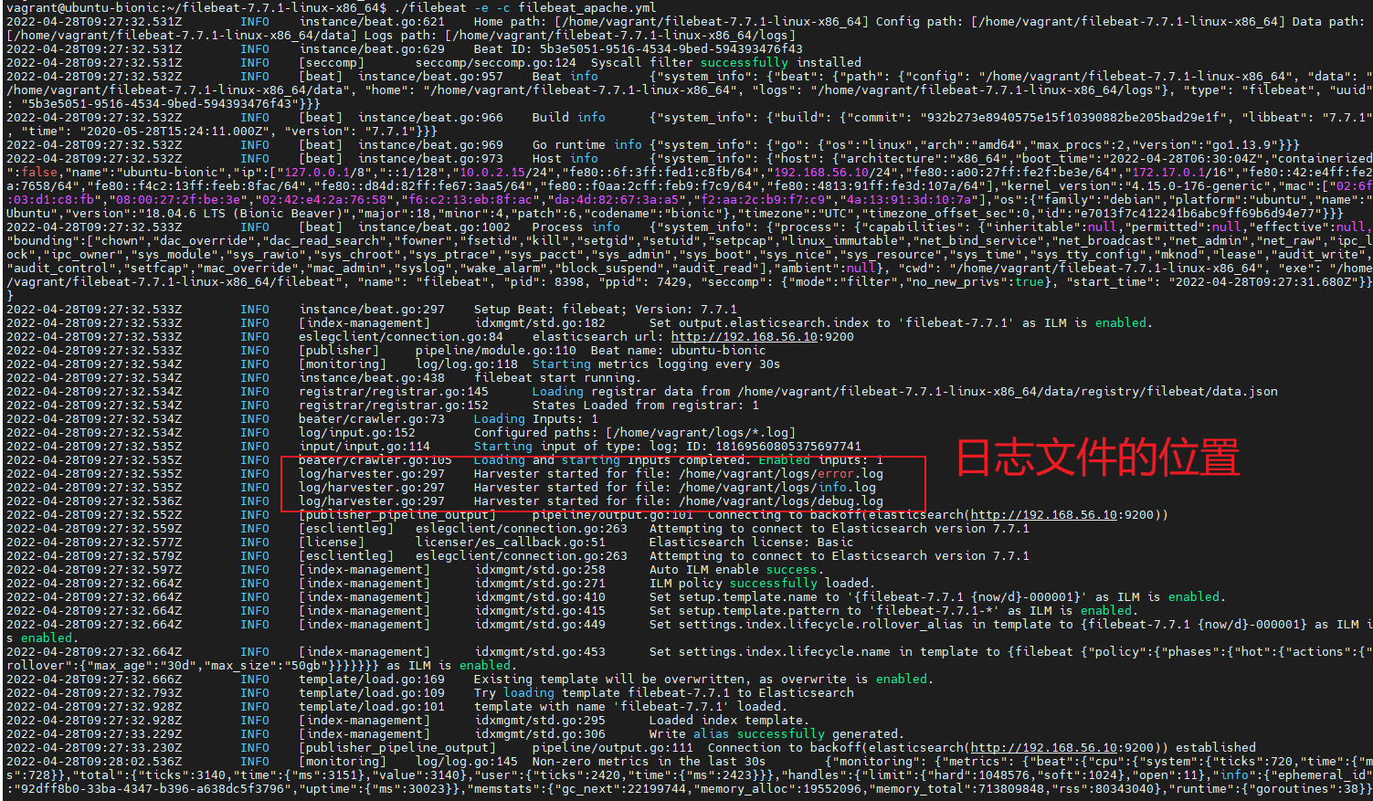然后,再运行 Filebeat, -c 表示运行指定的配置文件,这里是 filebeat_apache.yml。