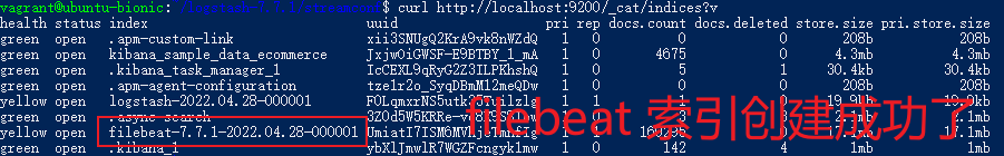 这个命令会查询 Elasticsearch 中所有的索引,如下图所示,filebeat-7.7.1-* 索引创建成功了。因为我没有配置索引的名字,所以这个索引的名字是默认的,。