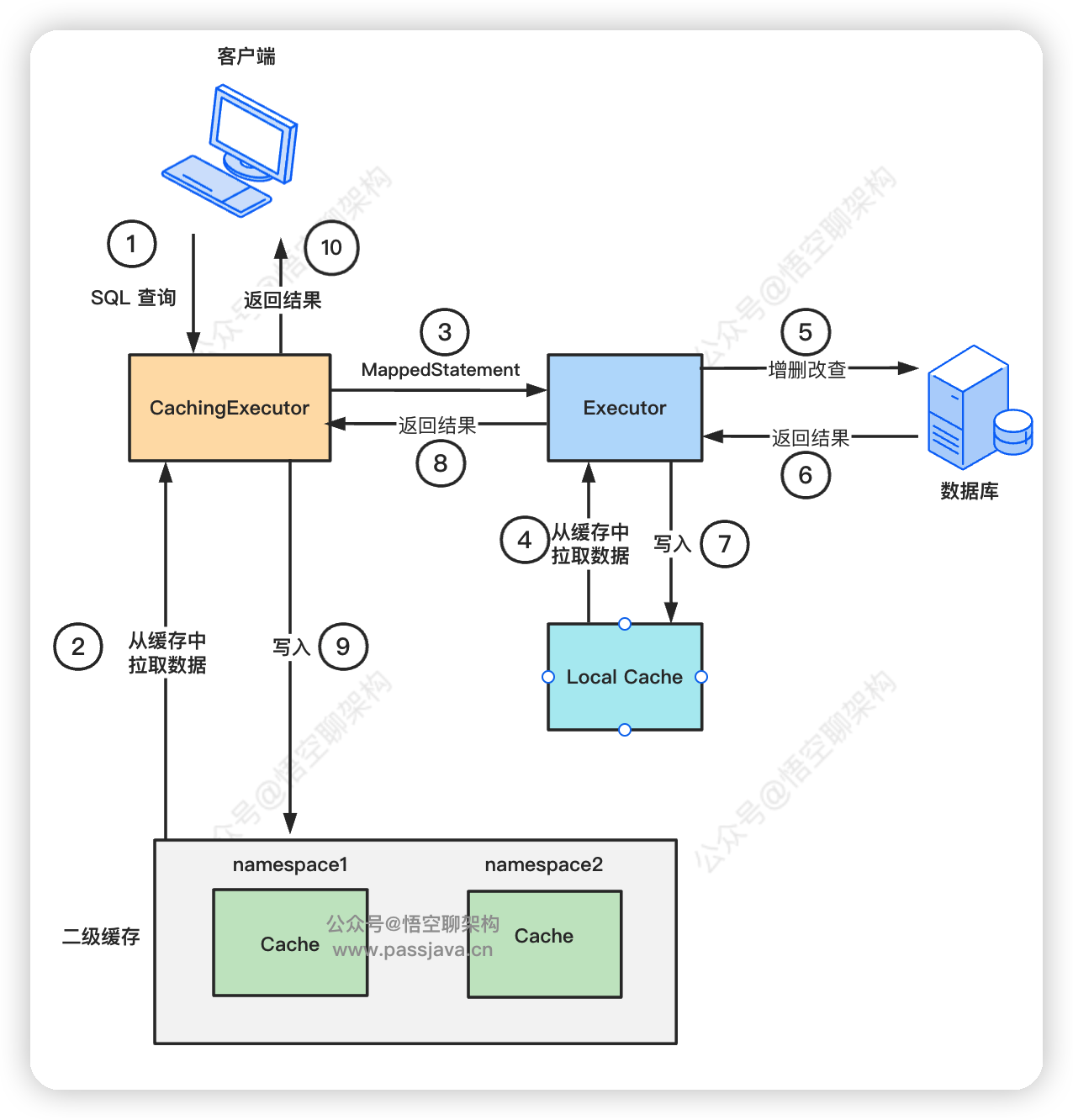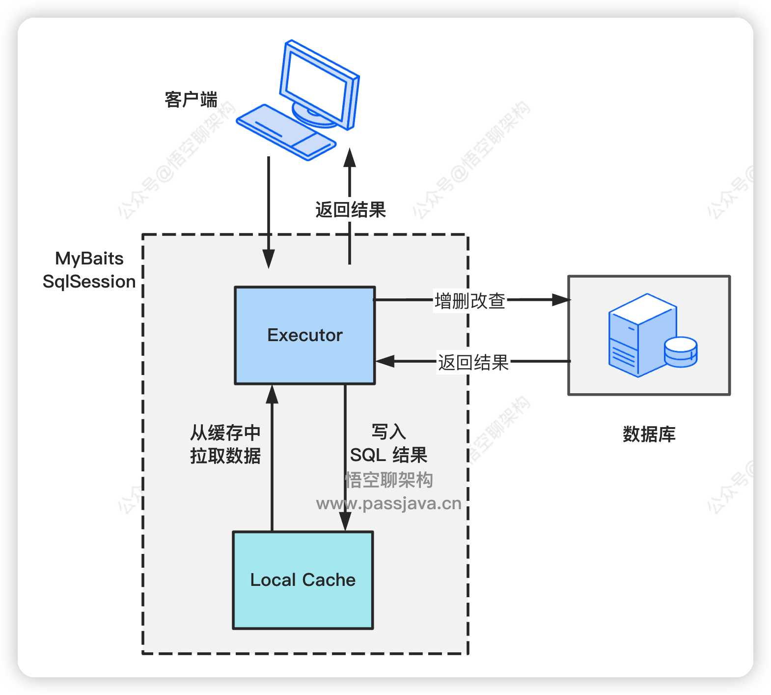 每个SqlSession中持有了Executor,每个Executor中有一个LocalCache。当用户发起查询时,MyBatis根据当前执行的语句生成MappedStatement,在Local Cache进行查询,如果缓存命中的话,直接返回结果给用户,如果缓存没有命中的话,查询数据库,结果写入Local Cache,最后返回结果给用户。