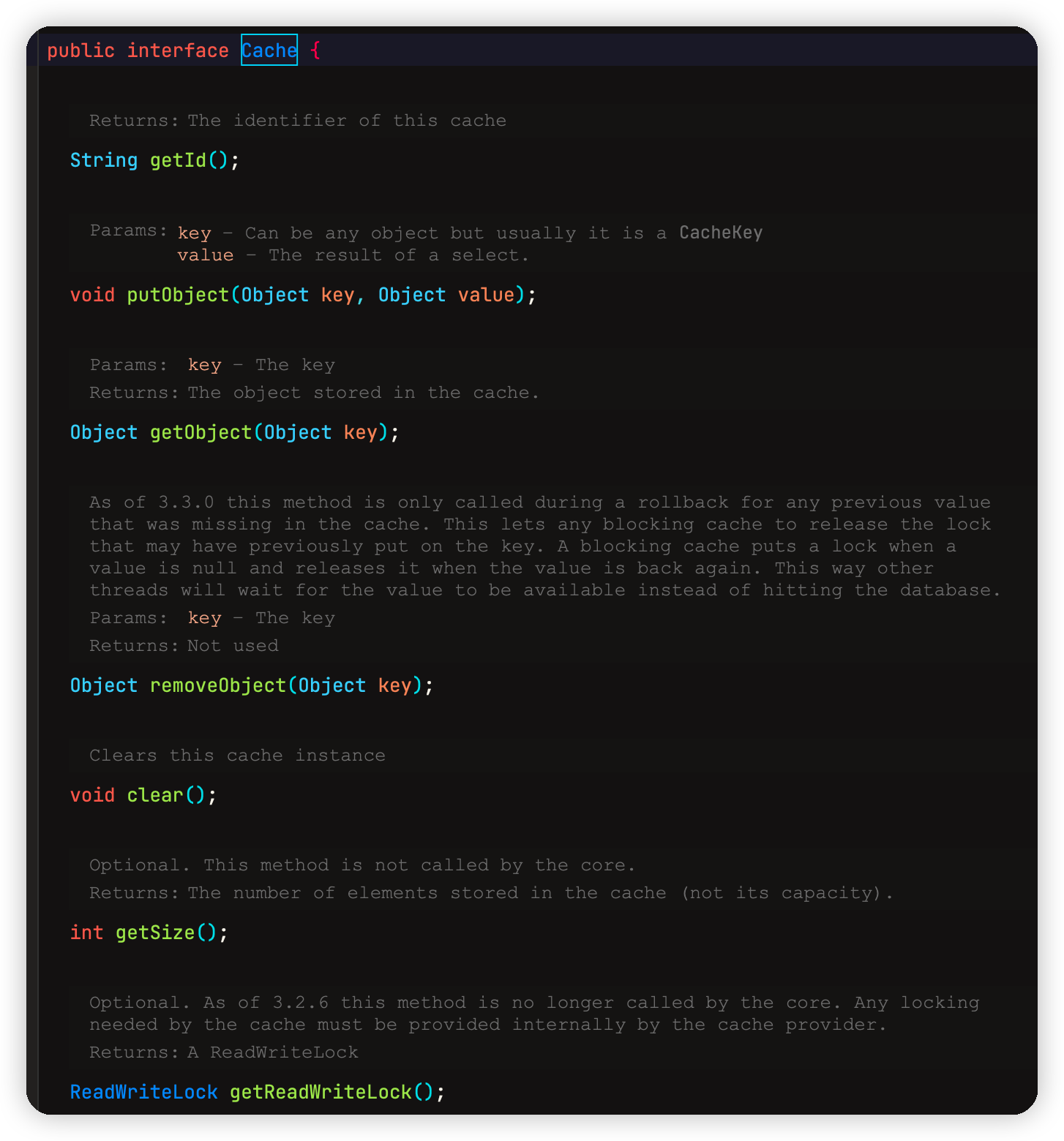 自定义缓存需要实现 MyBatis 规定的接口:org.apache.ibatis.cache.Cache。这个接口里面定义了 7 个方法,我们需要自己去实现对应的缓存逻辑。