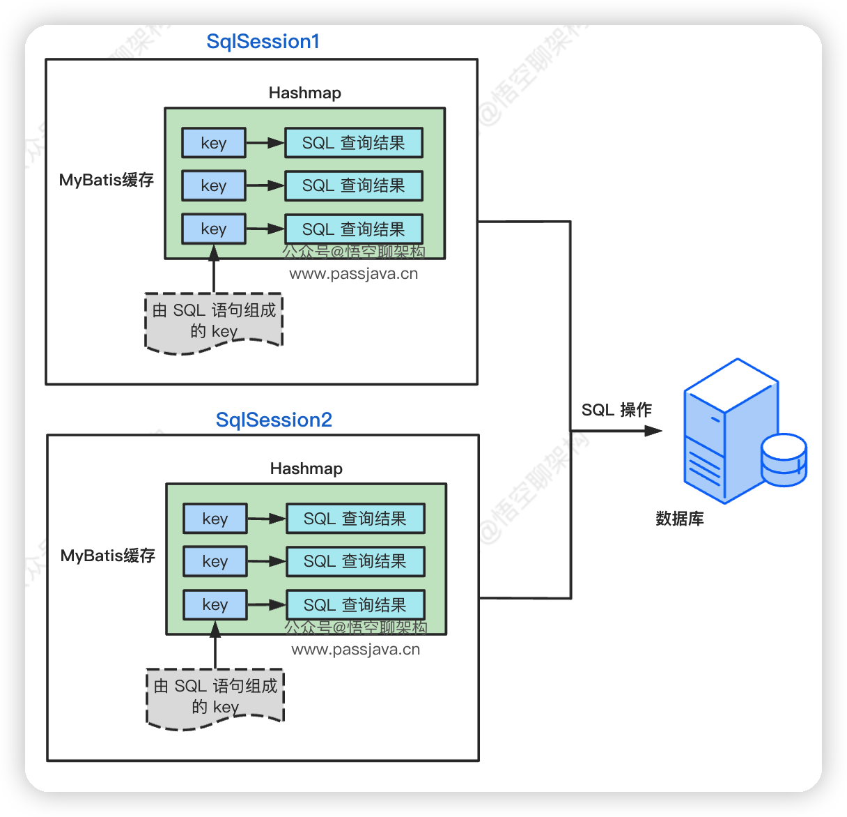 如下图所示,有两个 SqlSession,分别为 SqlSession1 和 SqlSession2,每个 SqlSession 中都有自己的缓存,缓存是 hashmap 结构,存放的键值对。