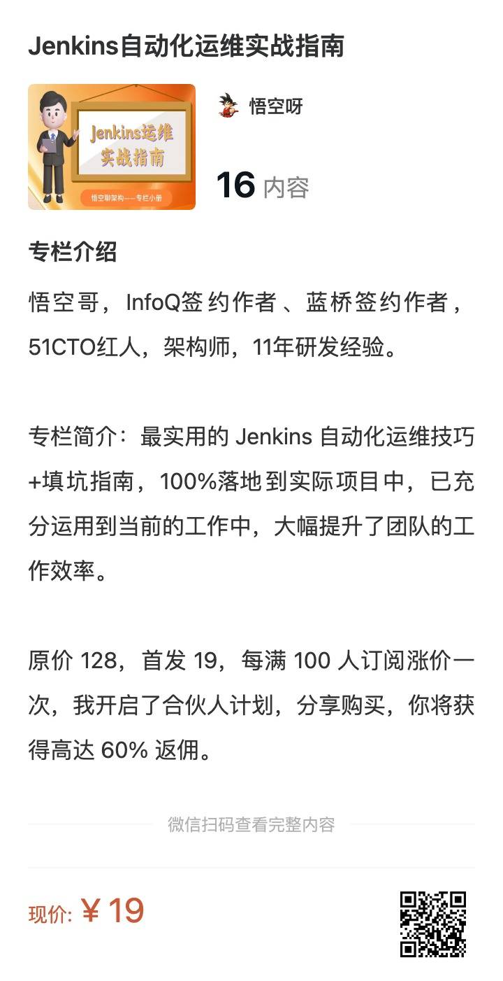 最实用的 Jenkins 自动化运维技巧+填坑指南,100%落地到实际项目中,已充分运用到当前的工作中,大幅提升了团队的工作效率。