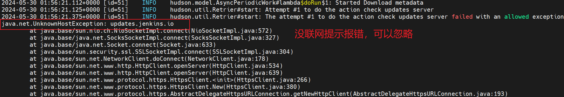 再次启动,运行成功。另外有一个提示无法访问 jenkins 更新网站的错误,可以忽略,因为该服务器没联网所以访问不到。