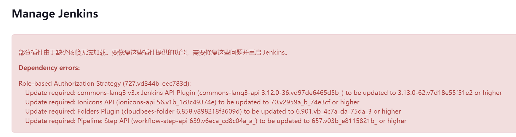 部分插件由于缺少依赖无法加载。要恢复这些插件提供的功能,需要修复这些问题并重启 Jenkins。