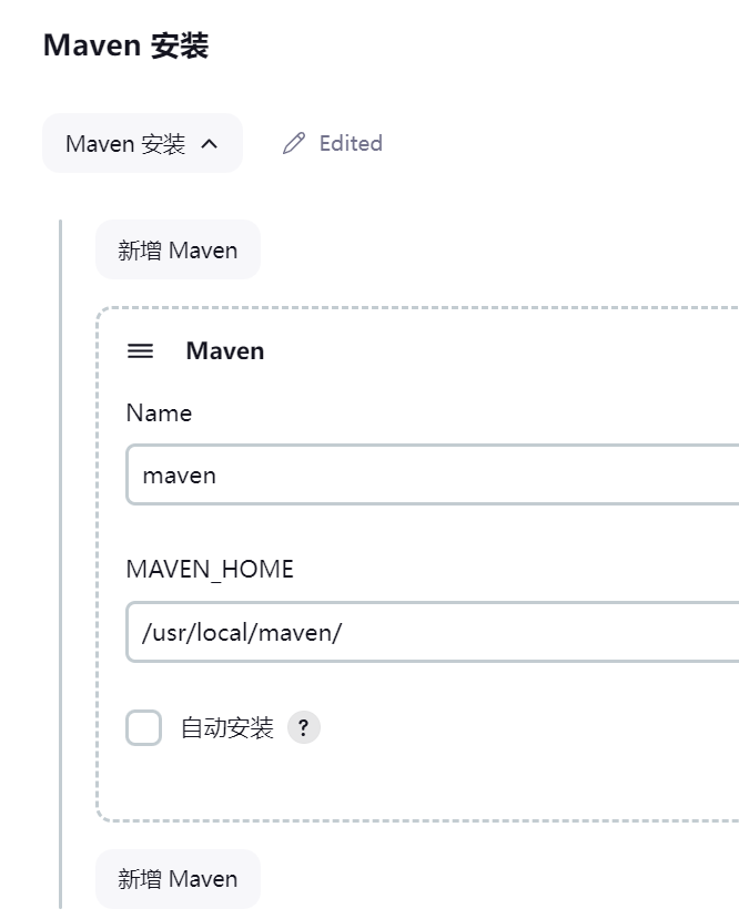 在 Jenkins 后台系统管理->全局工具配置中添加 Maven 安装配置,如下图所示。