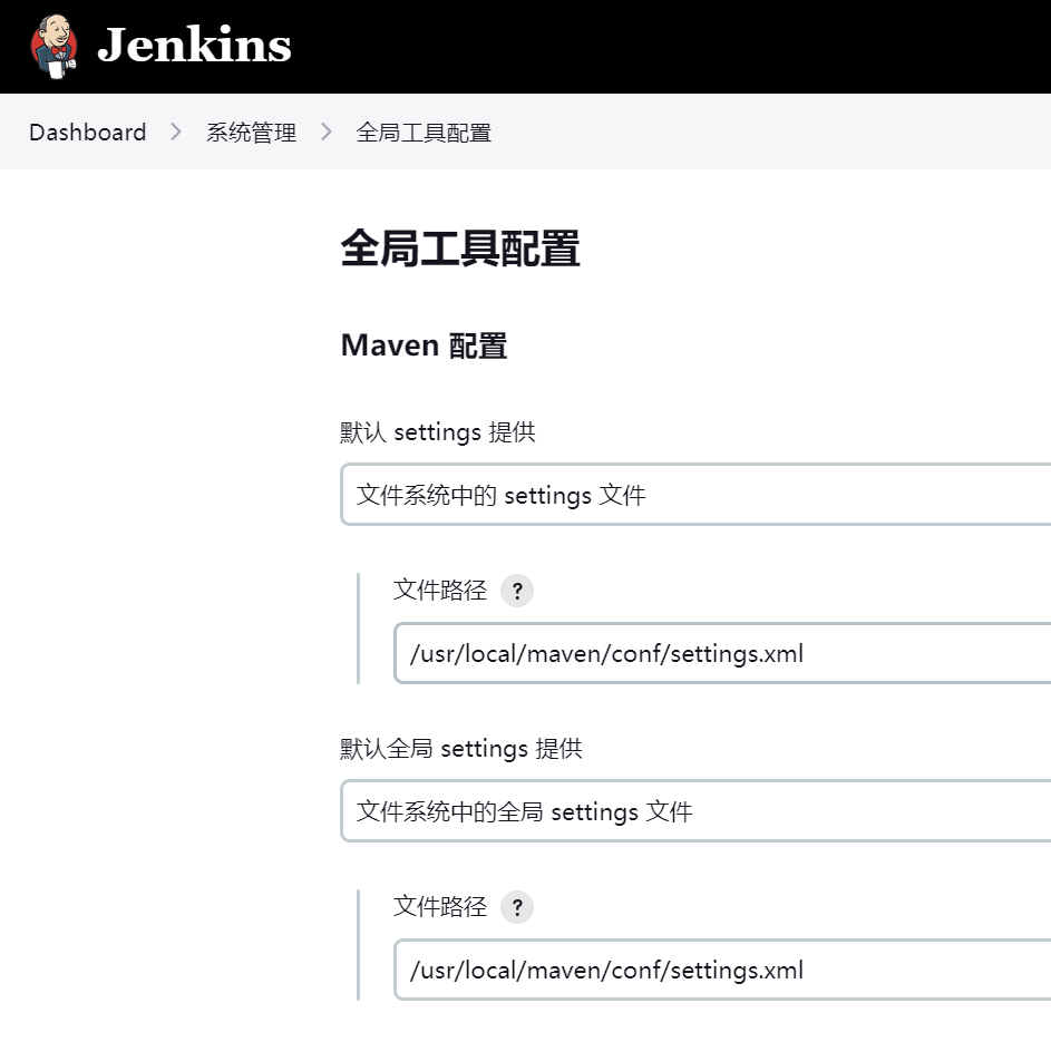 在 Jenkins 后台系统管理->全局工具配置中添加 Maven settings 配置,如下图所示。