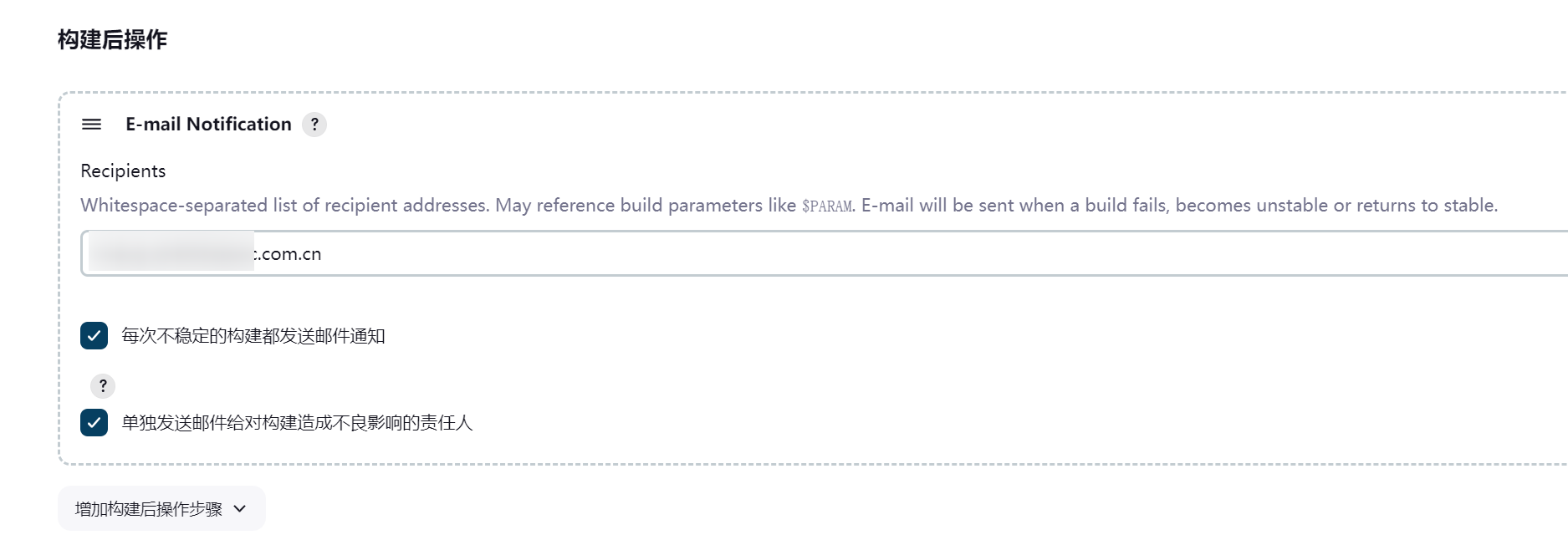 这个插件支持在自由风格项目中配置邮件通知,也可以用在流水线 Pipeline 脚本中。如下图所示,配置在自由风格项目中的配置: