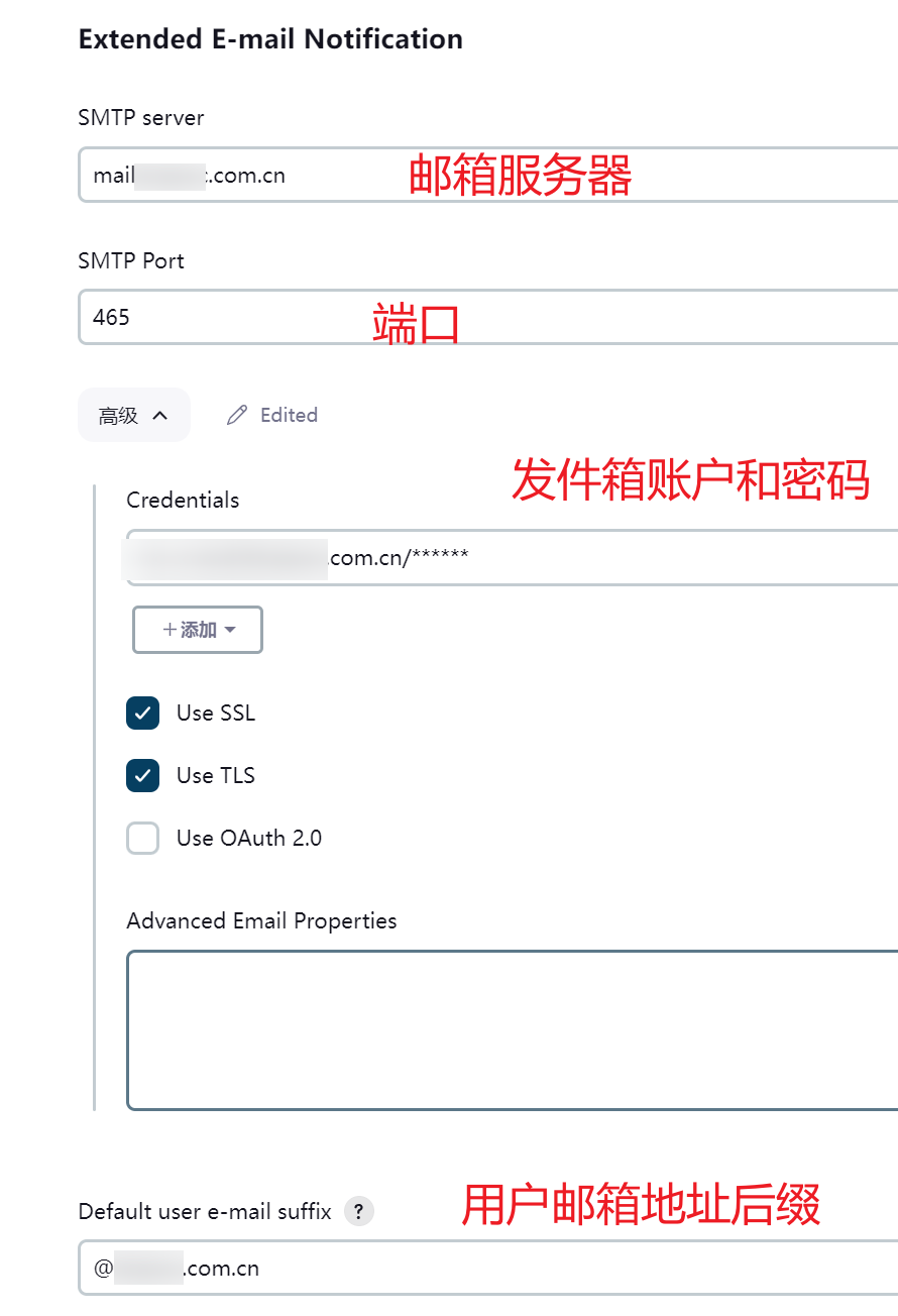 需要在全局配置中配置下邮箱服务器、端口、发件箱账号和密码以及用户邮箱地址后缀,如下图所示。