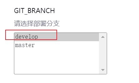 用了一个插件 gitParameter,可以获取 git 仓库的分支,部署的时候,可以选择分支。如下图所示,Git 仓库有 develop 和 master 分支,默认选中 develop 分支。