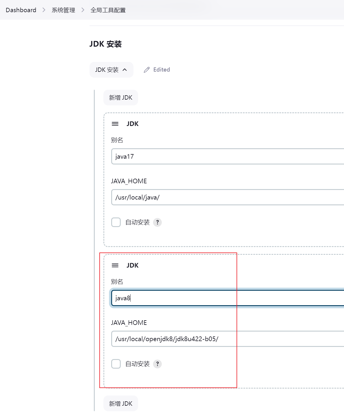接着配置下 jenkins JDK 工具。如下图所示: