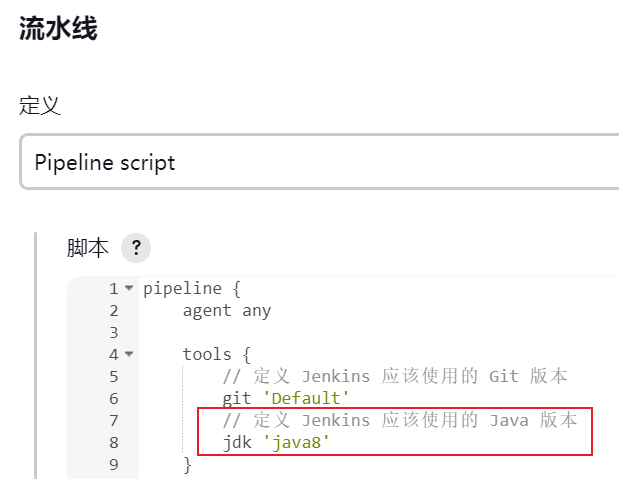 然后在 jenkins pipeline 脚本中配置下 tools 节点。如下图所示:
