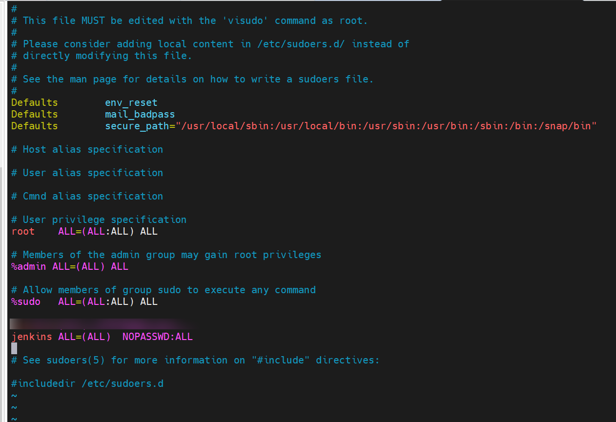 jenkins ALL=(ALL) NOPASSWD:ALL