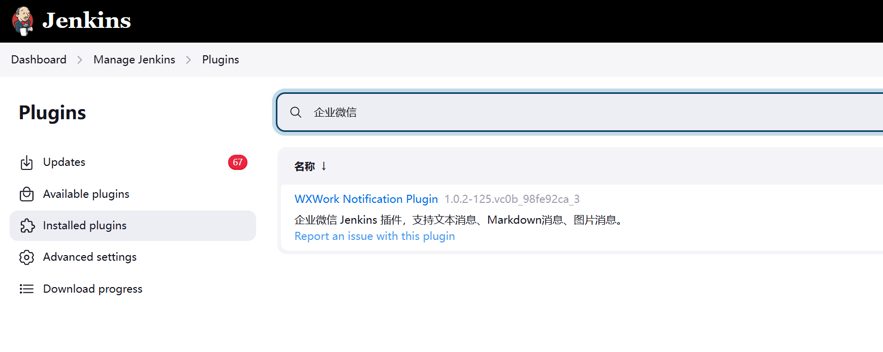 因为 Jenkins 并没有自带企业微信工具,所以需要手动安装下企业微信的插件。