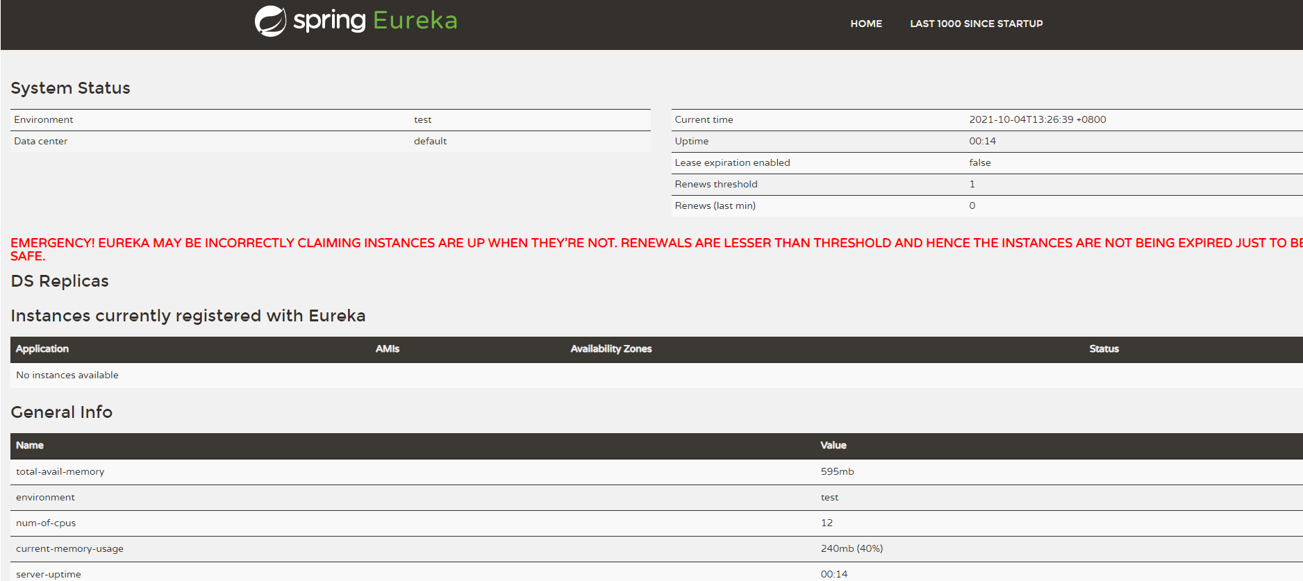 因为还没有服务注册到 Eureka,所以控制台中的服务列表是空的。