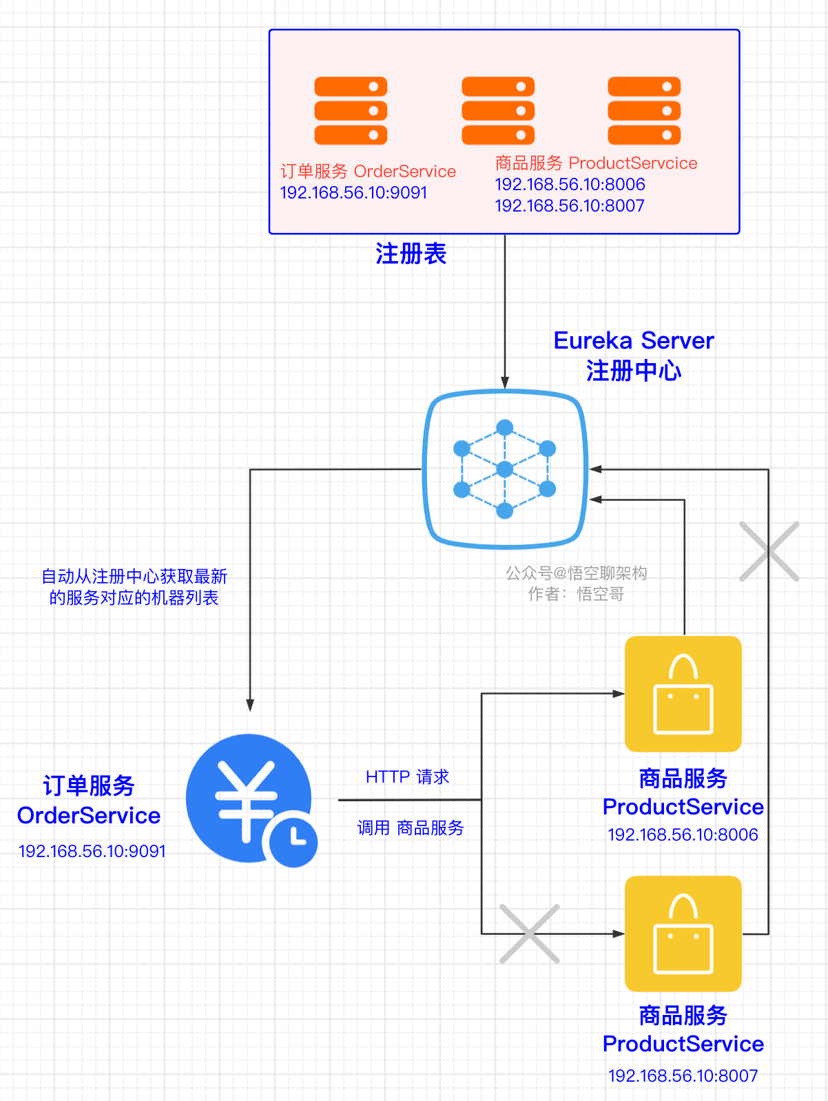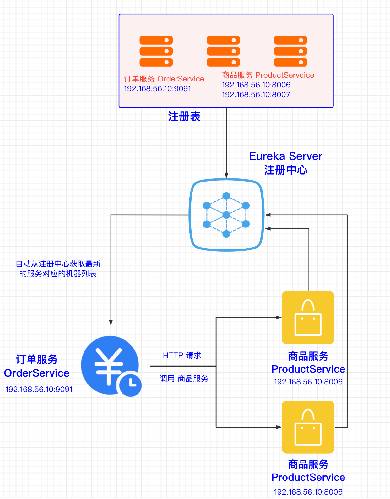 商品服务和订单服务都将自己的地址信息注册到 Eureka,Eureka 把这些信息都缓存到注册表中。