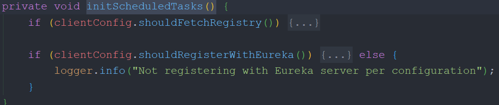 注意:在初始化调度任务的方法,会根据是否设置了抓取注册表信息和是否注册将 eureka-client 注册到 eureka-server 来执行上面的初始化操作。如下代码所示: