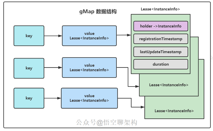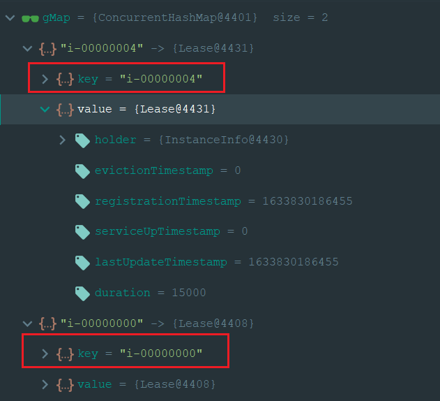 key就是一个 唯一 id,String 类型。值类似这种:i-00000004value里面存的是 Lease<InstanceInfo>。Lease是一个类,里面持有一个 instanceInfo 的 holder。这个 instanceInfo 就是注册过来的服务实例信息,包含 ip 地址,端口号等。