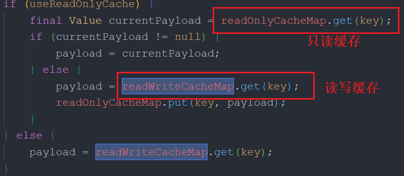 分为两级缓存,只读缓存 readOnlyCacheMap 和读写缓存 readOnlyCacheMap。