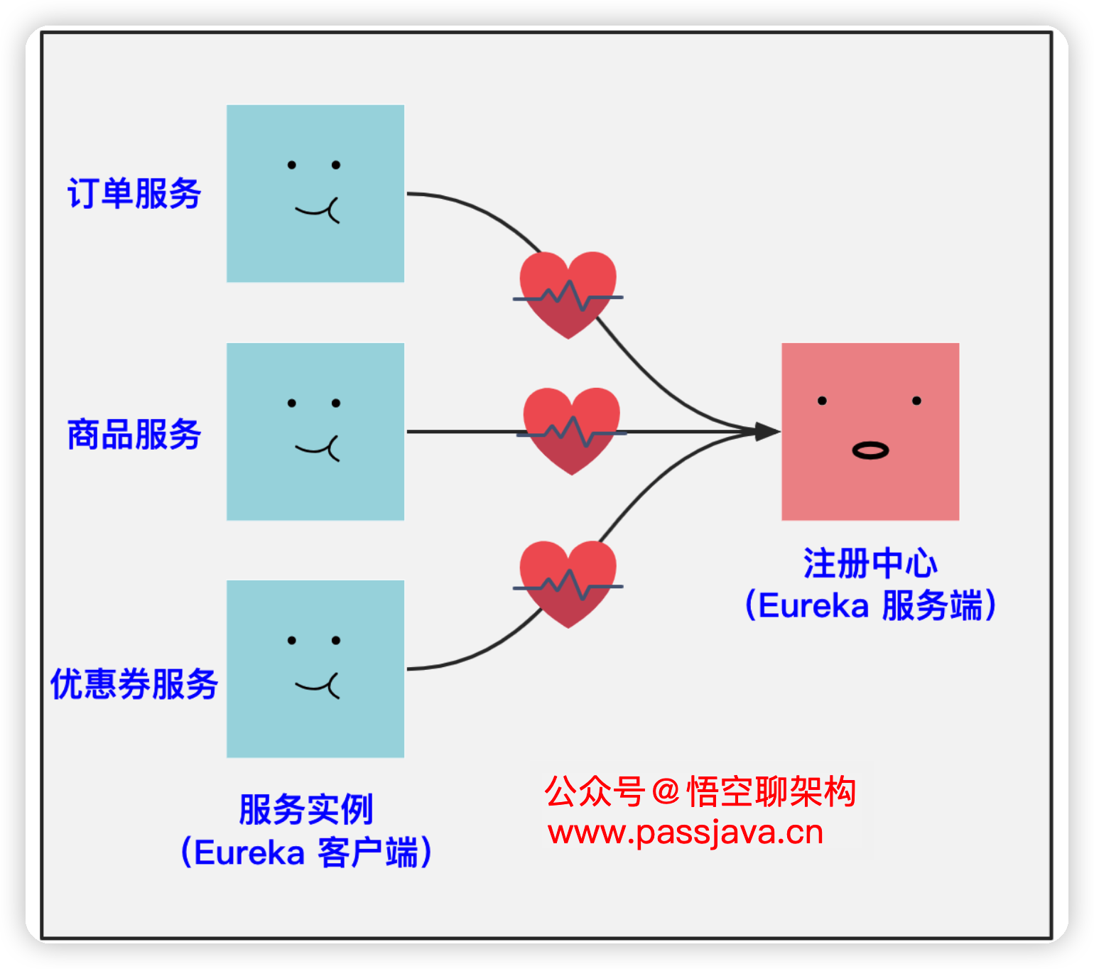 Eureka 采用的是客户端发送心跳请求给 Eureka 服务端。如下图所示:
