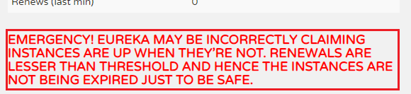RENEWALS ARE LESSER THAN THE THRESHOLD. THE SELF PRESERVATION MODE IS TURNED OFF.THIS MAY NOT PROTECT INSTANCE EXPIRY IN CASE OF NETWORK/OTHER PROBLEMS.