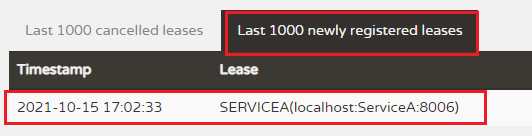 Last 1000 newly registered leases,这个列表里面会显示 最后1000个新注册的租约。比如悟空我的机器上就是 Service A。