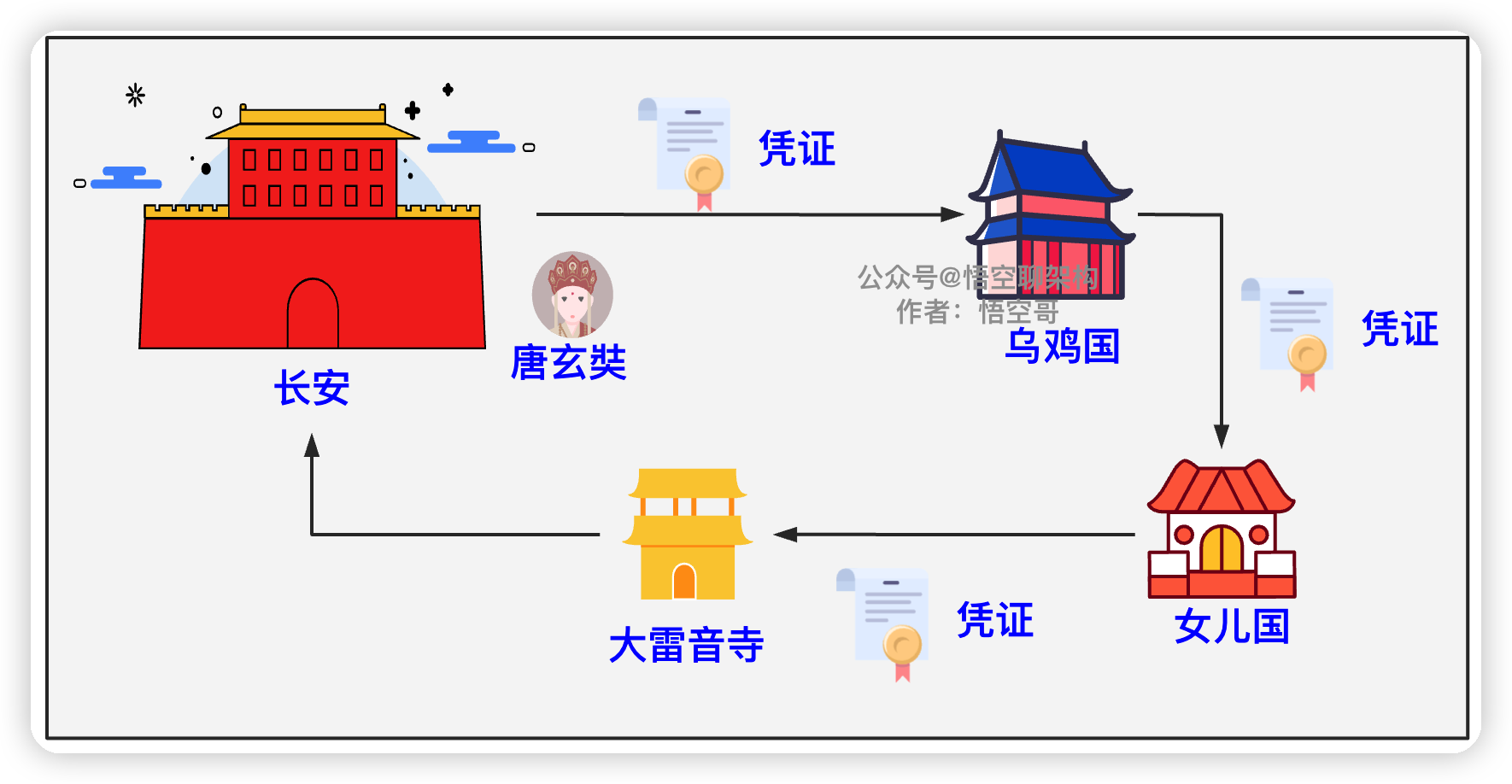 长安是一个颁发凭证(通关文牒)的微服务节点,乌鸡国、女儿国和大雷音寺等都是集群中的一个微服务节点,唐玄奘拿着凭证访问各国。