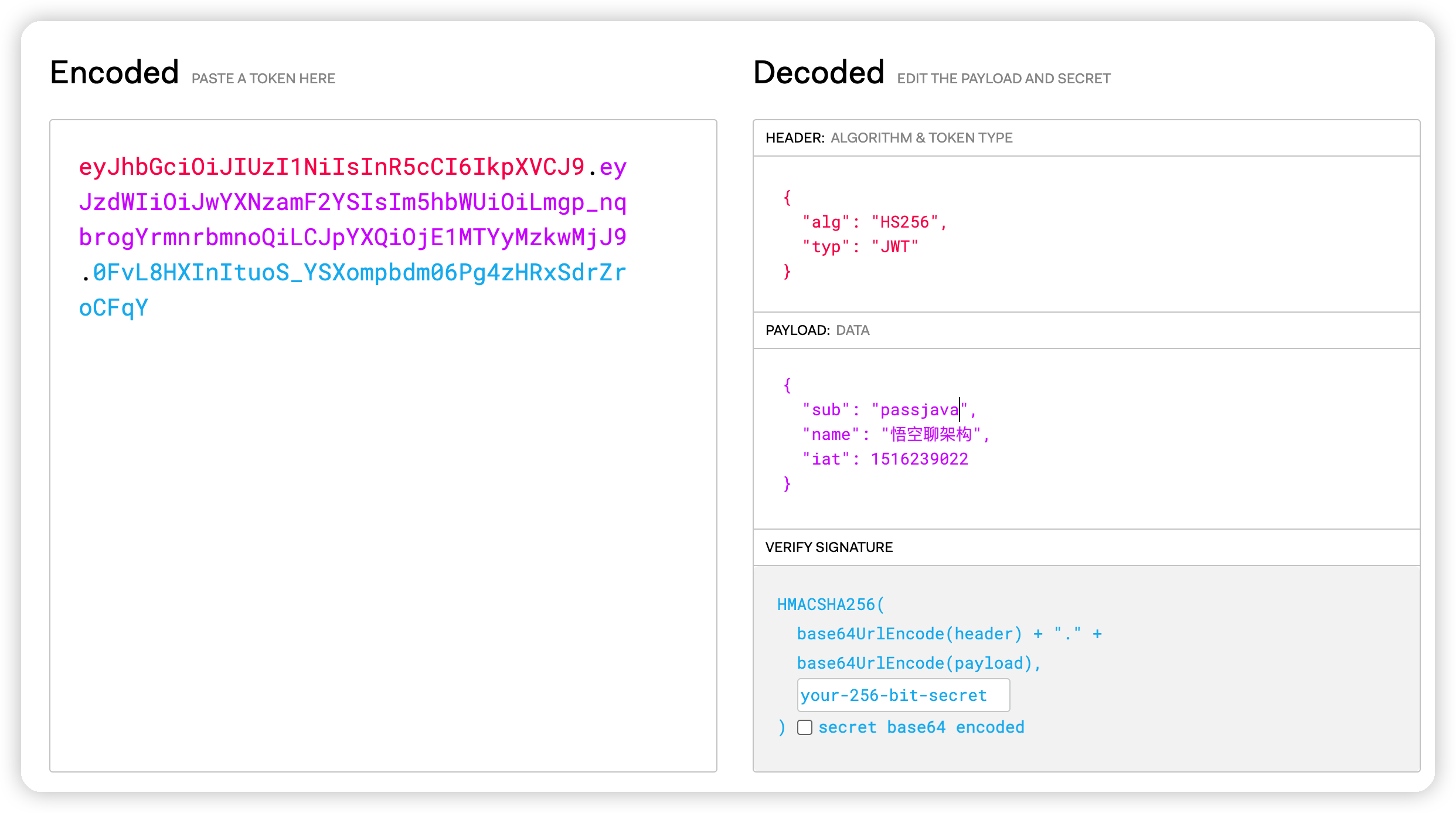 以上截图来自 JWT 官网(https://jwt.io),数据则是悟空随意编的。