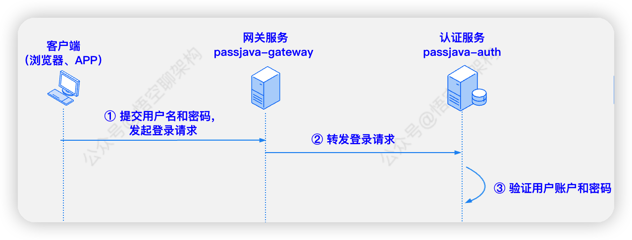 ② 转发请求:这里会先将登录请求发送到网关服务 passjava-gateway,网关对于登录请求会直接转发到认证服务 passjava-auth。(网关对登录请求不做 token 校验,这个可以配置不校验哪些请求 URL)