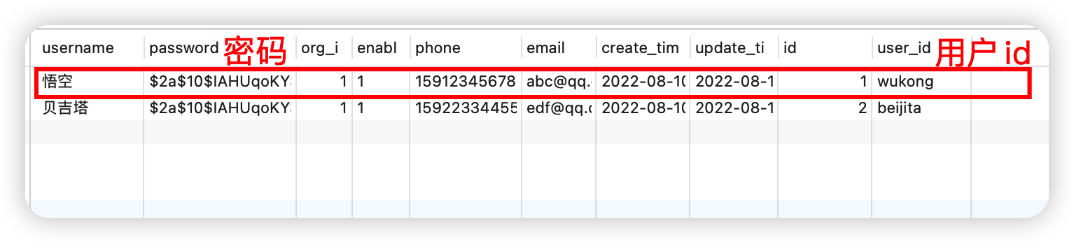 所以为了让用户登录成功,还需要在数据库插入一条系统用户,用户 id 为 wukong,密码是对 123456 加密后的密码。