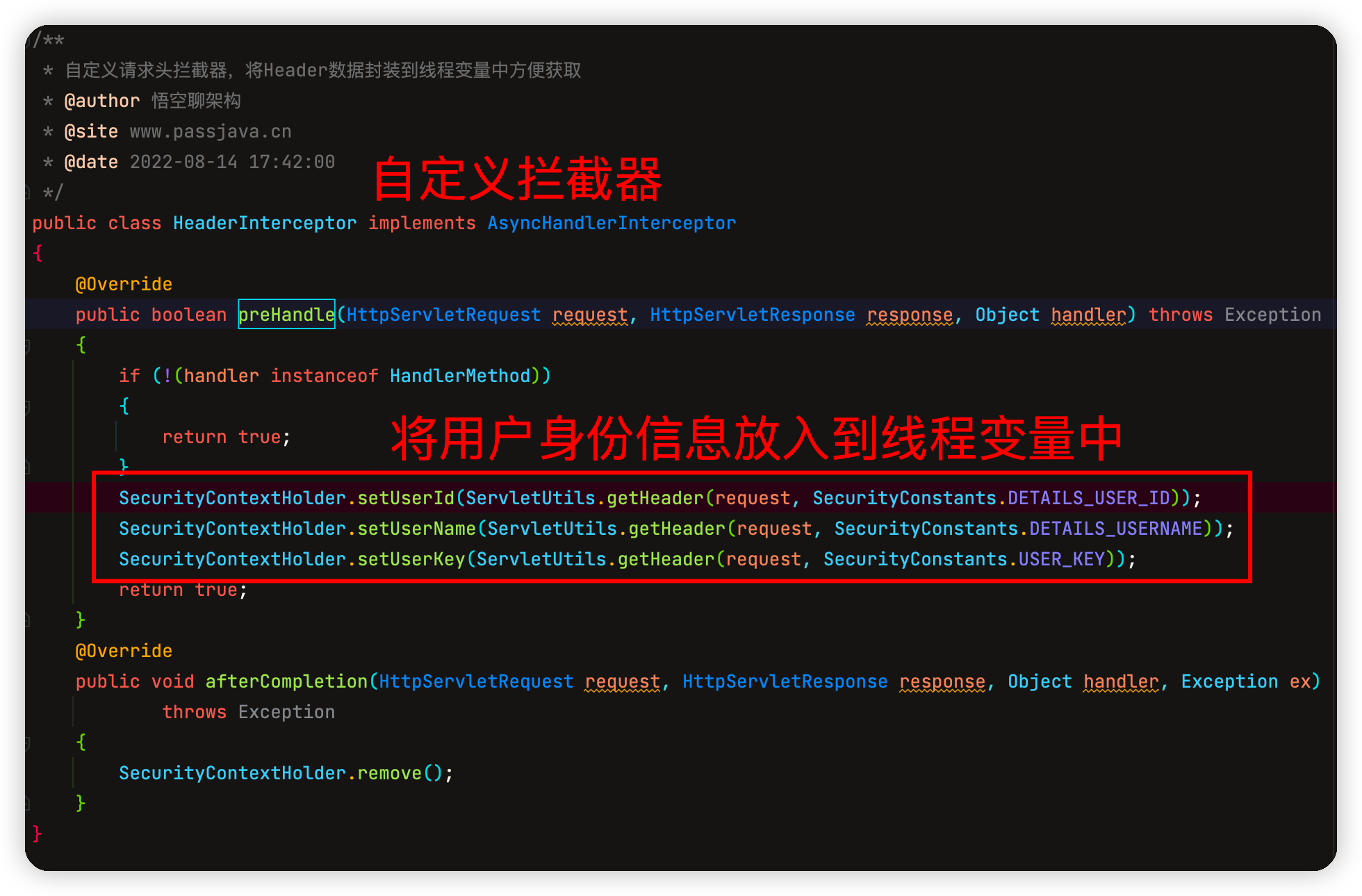 在 passjava-common 模块中新增一个拦截器,获取请求头中的身份信息,加入到线程变量中。文件名为 HeaderInterceptor。