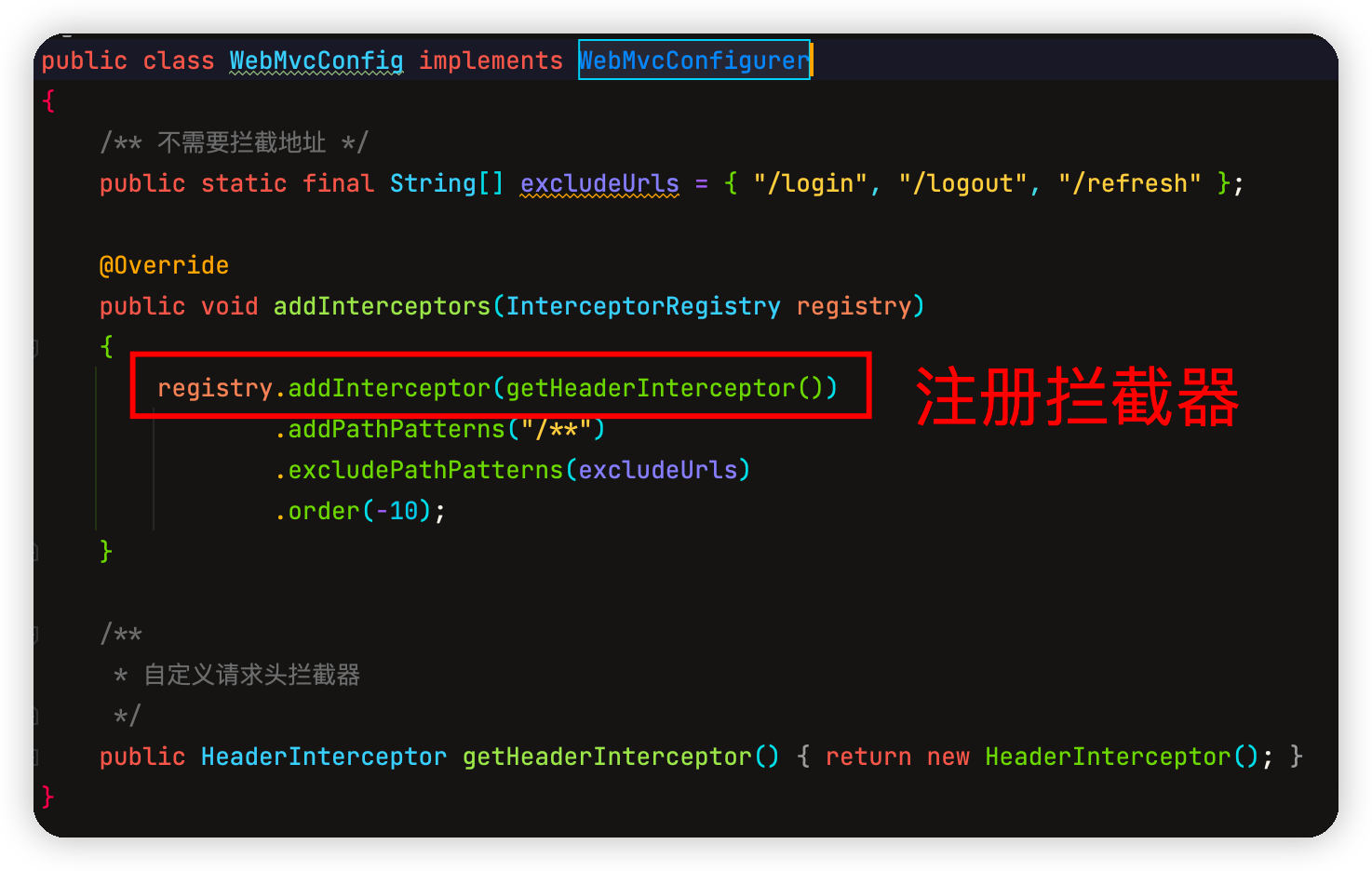 将拦截器注册到 WebMvcConfigurer。文件名为 WebMvcConfig.java。