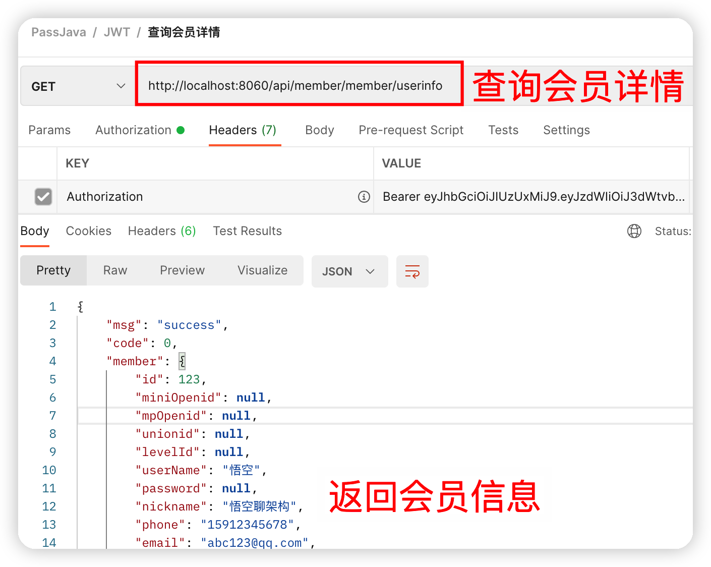 然后认证服务就会将 JWT 令牌返回给客户端了。当客户端想要查询这个 userId 对应的会员信息时,就可以在请求的 Header 中带上 JWT 令牌。